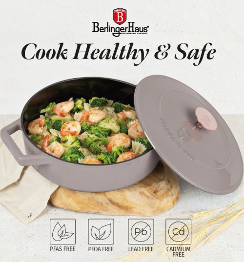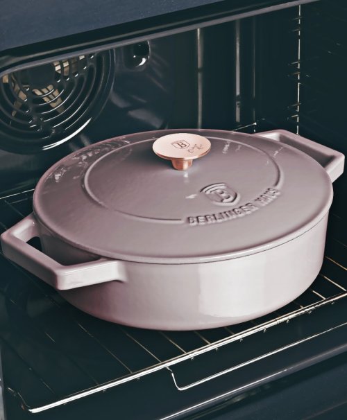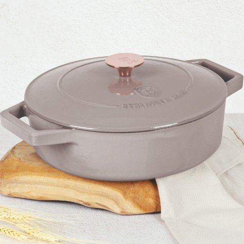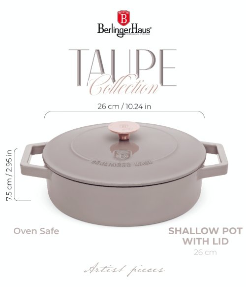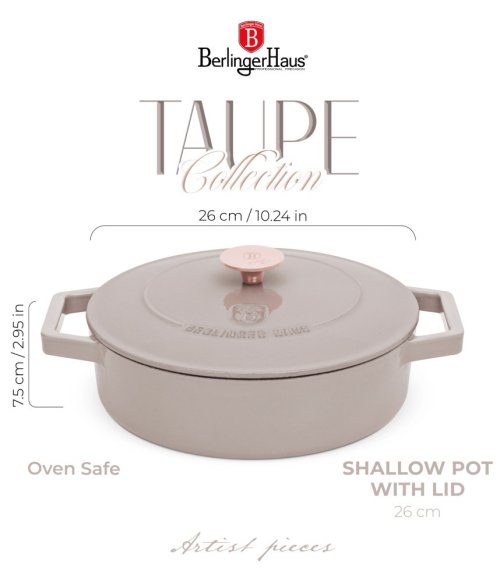Liatinový kastról s 2-vrstvovým ENAMEL povrchom. Priemer 26 cm, výška 7,5 cm. Obsah 2,57 litra. Farba Taupe.