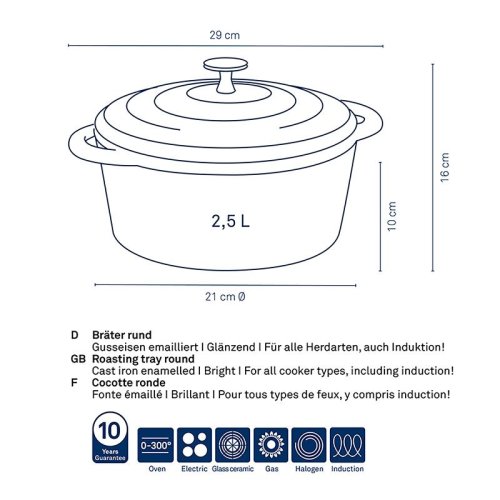 Trendy riadu s dlhou životnosťou zo série kela Calido: okrúhly pekáč s lesklým povrchom a pokrievkou má priemer 21 cm a pojme 2,5 litra. Tento krásny okrúhly pekáč v šedom prevedení je vyrobený z liatiny a má béžovo smaltované vnútro. Pekáč je ideálny na opekanie mäsa (do 300 ° C) a pre dusené jedlá, ktoré by sa mali dusiť vo vlastnej šťave po dlhú dobu. Pekáč je súčasťou rozsiahleho sortimentu riadu! Liatina smaltovaná svetlo šedá/béžová 21cm, 10cm v, 2,5L