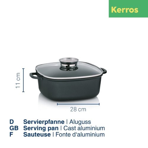 Kerros séria je vyrobená zo silného liateho hliníka s hrúbkou steny 5 mm. Zvláštny znak kvality: 6 hviezdičkový nepriľnavý povrch GREBLON-C3+. 3-vrstvová, keramikou plnená teflónová vrstva sa vyznačuje vynikajúcou anti-adhéznym efektom, vysokou odolnosťou proti poškriabaniu a veľmi dobrou odolnosťou proti oderu.
