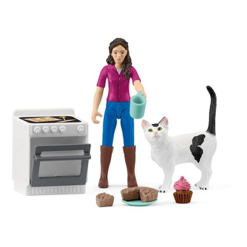 Čo to tu tak krásne vonia? Ach, Mrs. Kramer trávi popoludní pečením! Stojí pri rúre a vyberá voňavé cupcakes, zatiaľ čo zvedavá mačka jej robí spoločnosť a pozorne sleduje každý jej pohyb. Možno aj niečo dostane? Mrs. Kramer na to ale vôbec nemyslí - jablkový koláč je predsa pre ľudí. Na sporáku už je pripravený plech so sušienkami. Ak mačka bude pozerať dostatočne dlho, Mrs. Kramer jej určite podá aj mačaciu pochúťku. Medzitým si vezme šálku kávy, ukrojí si kúsok koláča a pustí sa do neho. Mňam! Obsah: 1x figúrka Mrs. Kramer, 1x mačka, 1x rúra, 1x tanier, 1x téglik, 4x jablkový koláč, 1x cupcake, 1x hárok so samolepkami. Hracia sada mini figúrok funguje samostatne, ale aj bez problémov so všetkými ostatnými výrobkami Schleich®. Hracia sada z kolekcie POCKET SET je vhodná pre deti od 4 rokov. Figúrky Schleich® podnecujú fantáziu a zaručujú hodnotný herný zážitok plný dobrodružstva. Rozmery balenia: 19,8 x 13,8 x 5,8 cm. Nevhodné pre deti do 3 rokov. Vek: 4+