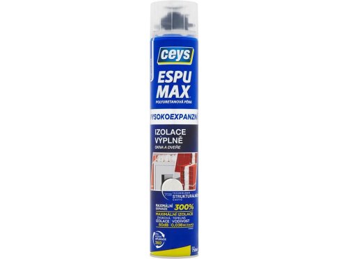 Espumax PU pena na izoláciu a výplň. Polyuretánová pena s vysokou expanziou (300%). Určená špeciálne na tesnenie, výplne a akustickú a tepelnú izoláciu. Po nanesení zväčší objemovú hmotnosť až na 40 litrov a vytvorí trojrozmernú štruktúru z dutých buniek, ktoré predstavujú bariéru proti hluku, teplu a vlhkosti. Je kompaktná a hutná. Balenie je vhodné na aplikáciu pištolí.