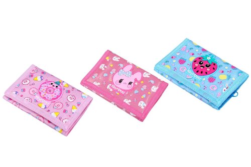 Modrá peňaženka s jahodou. Ružová peňaženka s šiškou. Červená peňaženka so zajacom.