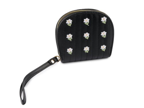 Malá šikovná peňaženka sa zmestí do každej kabelky. Prednú stranu má ozdobenú [výšivkou kvetov]. Tento roztomilý motív prinesie hravý prvok do vášho každodenného štýlu. Peňaženka je vybavená dlhým pútkom na nosenie na zápästí. Zatvára sa na zips. Vnútri nájdete hlavný priestor oddelený prepážkou na dva menšie. V prepážke je mincovník na zips. Po stranách sú ešte 4 priehradky na karty.