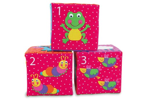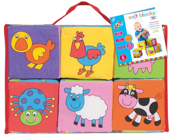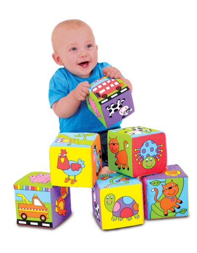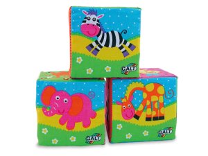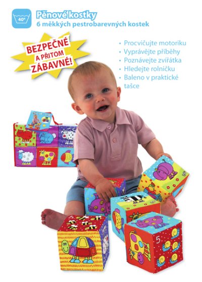 6 rôznofarebných kociek so zaujímavými obrázkami. Kocky sú vyrobené z mäkkého materiálu a sú bezpečné - ideálne na stláčanie, hádzanie a stavanie.