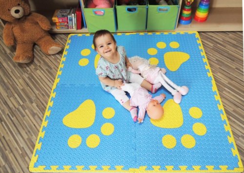 Obojstranné prevedenie, okraje a špeciálne vyvinutý systém zámkov: stačí iba štyri štvorce na vytvorenie veľkého množstva variantov. Otáčajte, kombinujte a vyberte si práve tú svoju alebo meňte vzhľad svojho koberca každý deň v týždni! Hrúbka 20mm: zaisťuje maximálnu bezpečnosť, dokonalú tepelnú izoláciu a významne absorbuje dupanie a hluk pri hre detí. Okrem použitia v izbách a detských hracích kútikoch rozširuje možnosti použitia aj ako podložka na cvičenie alebo ako mäkká dopadová plocha napríklad pod šmýkačku. Materiál EVA pena (etylénvinyl acetát): vyznačuje sa vysokou životnosťou a takmer nulovou údržbou (stačí utrieť vlhkou handričkou). Penový BABY koberec z EVA peny je hygienický, umývateľný a zdravotne nezávadný. Odoláva aj veľkému zaťaženiu, možno ho úspešne využiť aj v exteriéri - na terasu, balkón či na záhradu. Doprajte svojim deťom bezpečnú hernú plochu bez alergénov, roztočov a prachu! Štruktúrovaný povrch: umocňuje luxusný vzhľad a je príjemný na dotyk. Štruktúra je rovnaká z oboch strán, u detí rozvíja hmatové vnímanie. Penové puzzle - veľké tvary: s Penovým BABY kobercom nehrozí, že by Vaše deti kúsok prehltli alebo vdýchli! Veľké tvary sú atraktívne aj pre malé deti – mávajú nimi nad hlavou, používajú ich namiesto sedadiel, dávajú im svojou fantáziou nový smer použitia. Ľahko ich možno skladať a vytvára na koberci prekrásny vzor. Jasné a sýte farby: rozžiaria a zútulnia nielen detskú izbu. Hracie plochy majú byť veselé, a Penový BABY koberec to na jedničku spĺňa.