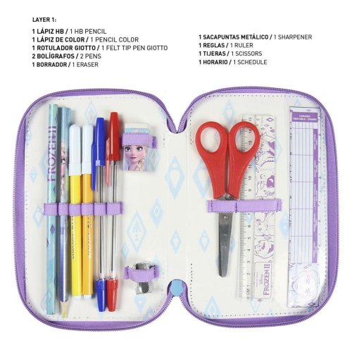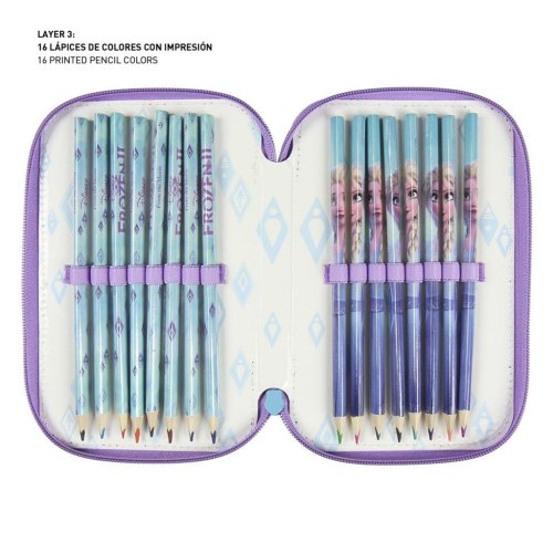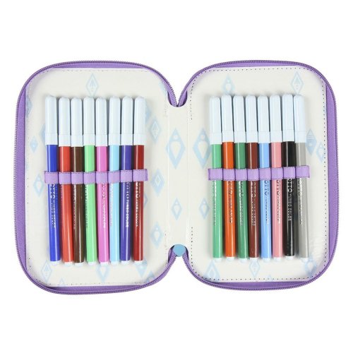 Peračník 3 poschodový Premium Ľadové kráľovstvo s flitrami. Peračník obsahuje 16 pasteliek, 20 fixiek, pravítko, gumu, nožnice, strúhadlo, 2 obyčajné ceruzky a 2 prepisovačky. Rozmer peračníka je 12,5 × 19,5 × 6 cm. Materiál 100% polyester.