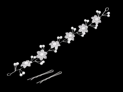 Romantická ozdoba s kvetmi a perlovými korálkami bude jemným a elegantným doplnkom účesu. Je tvorená z dvoch do seba zapletených drôtikov, do ktorých sú vkomponované voskové korálky pripomínajúce perly a plastové kvety. Vďaka drôtikom je ozdoba ľahko ohýbateľná a je možné ju priestorovo tvarovať. Čelenku využijete ako nevšedný doplnok na svadby, sväté prijímanie či na plesy. K vlasom ju upevníte pomocou vlasových sponiek, ktoré sú súčasťou balenia. Môžete ju priviazať aj stuhou alebo gumou, ktorú prevlečiete do očiek (cca Ø7 mm) na koncoch ozdoby. Stuha ani guma nie je súčasťou balenia.