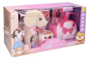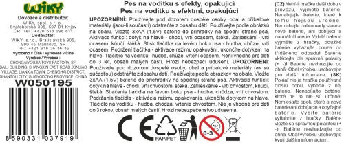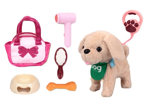 Pes chodiaci na vodítku s funkciami. Káblové ovládanie. Veľkosť 25 cm. Zvukové efekty. Dotyk psa - chodí, vrtí chvostom, šteká. Zatlieskanie - vrtí chvostom, narieka, opätovný potlesk - chodí, vrtí chvostom, šteká. Tlačidlo na ľavom boku psa - hudba, chôdza, vrtenie chvostom, opätovné stlačenie - hudba, chôdza, vrtenie chvostom. Držanie tlačidla - opakuje čo hovorím, ukončenie dotykom hlavy. Vodítko - stlačenie tlačidla - hudba, chôdza, vrtenie chvostom, opätovná tlač zmena hudby. 3xAA batérie do psa zo spodnej strany nie sú súčasťou. Prepínač ON/OFF na spodnej strane psa. Odnímací plyšový poťah psa na vyčistenie. Súčasťou miska, kosť, kefa, fén, taška.