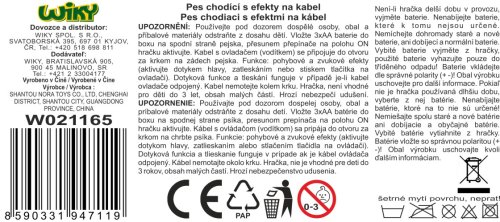 Pes chodiaci s efektmi na kábel. Veľkosť 22 cm. Kábel s ovládačom sa pripája do otvoru na krku. Chôdza, štekanie, vrtenie chvostom, pohyb hlavy. Stlačením vodítka (ovládača) - chôdza. Dotykom hlavy - efekty. Zatlieskanie - chôdza. 3xAA batérie nie sú súčasťou. Prepínač ON/OFF na batériovej krabičke na spodnej strane psa pod suchým zipsom.