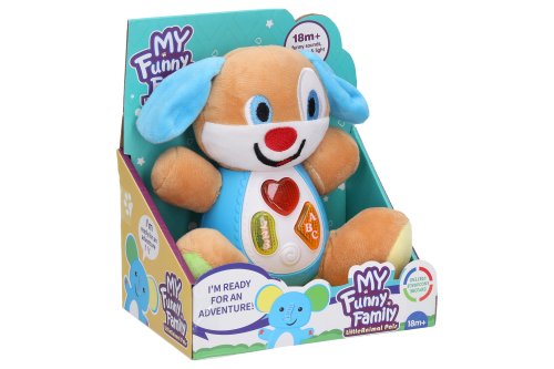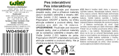 Pes interaktívny pre najmenších s efektmi. Rozmery 22,5x11,5x18,2 cm. ON/OFF prepínač na strane psa. Plyšový s plastovým bruškom. Aktivácia tlačidlami na brušku - svetelné efekty, zvukové efekty a melódie. Batérie 2xAAA, nie sú súčasťou.