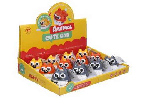 Pes s kosťou naťahovacou. Veľkosť 8cm. Naťahuje sa zatiahnutím za kocku. Potom ide pes dopredu kosť naháňa. Display box - 12 ks. 3 varianty - šedá, oranžová, žltá.