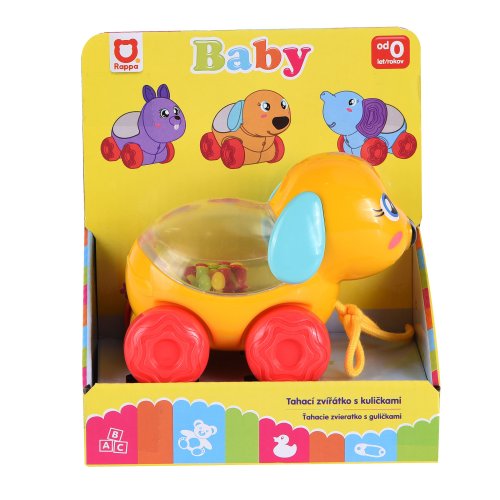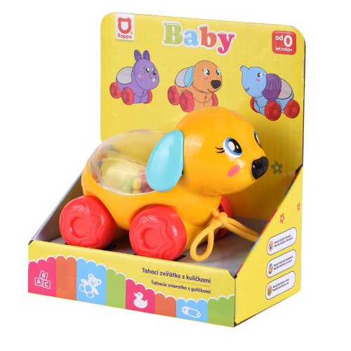 Veselé zvieratko psík na kolieskach s farebnými guličkami. Ťahaním či pohybom zvieratka začnú guličky vo vnútri poskakovať. Táto hračka zaujme a pobaví aj tie najmenšie deti.