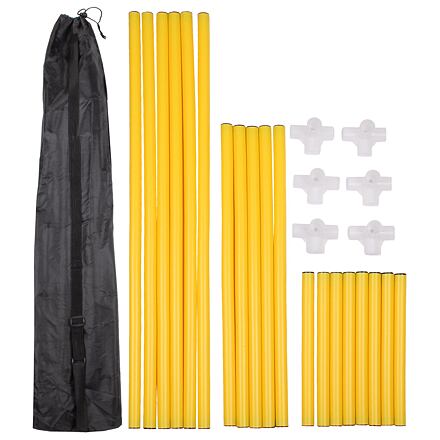Pripravte na súťaže svojho psa s agility prekážkami Pet Trainer! Tyče rôznych dĺžok vyrobené z PVC jednoducho prepojíte pomocou spojok a vytvoríte tak prekážkovú dráhu, slalom alebo akúkoľvek dráhu podľa vášho priania. Prekážky sú vhodné pre menšie aj väčšie plemená psov. Celá sada je zabalená v praktickom obale pre ľahké uskladnenie a prenášanie. Začnite s tréningom a dostaňte svojho psíka do formy s týmto praktickým balením agility prekážok! Parametre: rozmery balenia: 100 x 14 x 14 cm hmotnosť: 1,6 kg materiál: PVC Obsah balenia: 6x – päťcestná spojka 8x – tyč 30 cm 5x – tyč 60 cm 6x – tyč 85 cm 1x – prenosná čierna taška