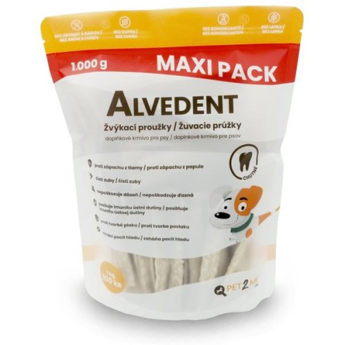 videlné užívanie žuvacích prúžkov Alvedent pomáha odstraňovať zápach z papule psa a brániť tvorbe plaku (z vrstiev plaku sa vytvára zubný kameň). Obsiahnutá laktoperoxidáza zvyšuje prirodzenú imunitu a obranyschopnosť ústnej dutiny. Žuvaním chutných prúžkov si psy mechanicky čistia zuby a odstraňujú zvyšky krmiva. Súčasne sa tak uvoľňujú enzýmy, ktoré zabraňujú tvorbe plaku. Balenie obsahuje 20 ks žuvacích prúžkov po 10 g. Hlavné prednosti: