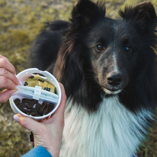 - plastová miska je rozdelená na 2 uzavreté časti - jednu možno využiť na maškrty, druhú na čisté vrecká na exkrementy