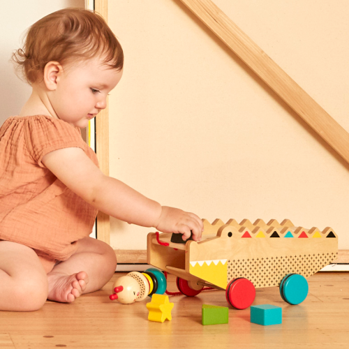 Aligátor je ťahacou hračkou a vkladačkou v jednom. Päť zavalitých kociek rôznych tvarov je možné jednoducho vložiť do otvorov v aligátorovi. Hračka stojí na štyroch farebných a pogumovaných kolesách, ktoré zaisťujú hladký pohyb po domácich podlahách. Hračka je vyrobená z odolného dreva, a tak Vám určite vydrží po mnoho rokov. Hlavné vlastnosti: rozvíja koordináciu ruka-okopodporuje poznávanie farieb a tvarovšnúrka na ťahanie a kvalitné kolieska nabádajú batoľatá k chôdzivyrobené z kvalitného dreva zo zodpovedných zdrojov a netoxických farieb na báze vodyspĺňa všetky bezpečnostné normy Značka a certifikát FSC® (Forest Stewardship Council) zaručuje, že drevo , z ktorého bol produkt vyrobený, nebolo vyťažené nelegálne a pochádza z lesov obhospodarovaných šetrným či prírode blízkym spôsobom, v ktorom sú dodržiavané prísne environmentálne a sociálne požiadavky. Značka FSC® na výrobku znamená, že svojim nákupom pomáhate chrániť lesy a podporujete šetrné, zodpovedné či prírode blízke hospodárenie, vďaka ktorému sú naše lesy stabilnejšie, zdravšie, majú prirodzenú druhovú skladbu a lepšie odolávajú negatívnym následkom klimatických zmien.