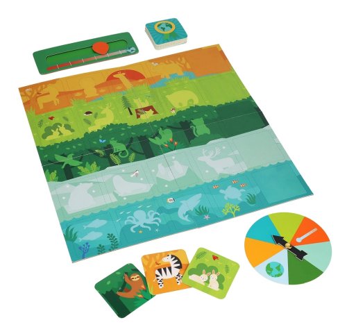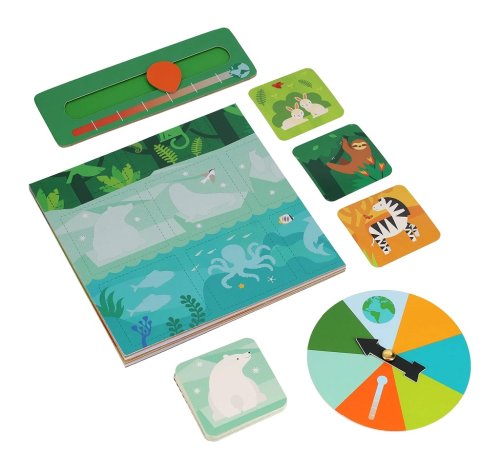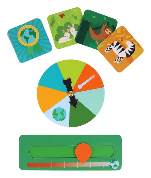 Táto hra o našom meniacom sa svete povzbudzuje hráčov, aby spolupracovali na vytváraní zdravého prostredia. Cieľom je vrátiť zvieratá do ich prostredia, než sa teplomer príliš zahreje. Všetci musia spolupracovať, aby vytvorili zdravé prostredie a tým zachránili planétu a vyhrali hru. Počas hrania sa dozviete o niektorých ekologických nebezpečenstvách, ktorým naša planéta čelí, ao tom, čo môžete urobiť, aby ste to zmenili. Keď sú všetky stanovištia obnovené a plné života, vyhráva každý! Táto kooperatívna hra podporuje tímovú prácu a spoluprácu. Vyrobené z 50% z recyklovaných materiálov a vytlačené na FSC® papieri rastlinnými atramentmi. Doskové hry sú skvelým spôsobom, ako sa deti naučiť hodnotám trpezlivosti, sústredenia, vyhrávania a prehrávania s gráciou a ako sa hrať s ostatnými. U mladších detí navyše rozvíja pohyb po hracej ploche, koordináciu ruka-oko a zručnosť. Hra je vhodnou pomôckou na precvičovanie angličtiny. Vyrobené z papiera FSC a potlačené rastlinnými atramentmi Na začiatku hry zamiešajte jednotlivé balíčky stanovíšť a umiestnite ich na samostatné kôpky blízko spinnera a posuvného teplomera. Ako prvý roztočí spinner najmladší hráč. Ak šípka dopadne na farbu, vyberte kartu daného stanovišťa. Ak je to karta Zviera, umiestnite ju na zodpovedajúce pole na hernom pláne; ak je to karta Nebezpečenstvo, umiestnite ju na prázdne pole na hernom pláne. Pokiaľ šípka pristane na ikone teplomera, potom posuňte jazdec na teplomere o jeden stupeň hore smerom k červenej. Ak šípka pristane na ikone Zeme, posuňte posuvník na teplomere o jeden stupeň dole. Ak je posuvník dole, potom znova otočte šípkou. Hra sa potom presunie na ďalšieho hráča. Hneď ako sa stanovište zaplní zodpovedajúcimi zvieratami, môžete pri ďalšom roztočení tejto farby odstrániť kartu Nebezpečenstvo a namiesto nej pridať kartu odmeny. Hra pokračuje, pokiaľ nie sú dokončené všetky stanovištia alebo pokiaľ posuvník nedosiahne hornú časť teplomera. Ak sa to stane, toto kolo hry je na konci. Vyčistite herný plán a začnite znova. Keď sú biotopy obnovené a plné života, vyhrávajú všetci! Ideálne pre rodiny, školské skupiny (skvelý spôsob pre pedagógov, ako predstaviť environmentálny jazyk deťom) a začínajúcich prírodovedcov, alebo ako darček pre malé deti pre zábavu bez obrazovky. Hlavné vlastnosti: hra pre 2 - 4 hráčov priemerná doba hry 15 minút obsahuje 20 kariet zvierat vyrobených z 50% z recyklovaných materiálov, vytlačené na FSC® papieri s rastlinnými atramentmi jazyk: anglický, holandský, francúzsky, nemecký, taliansky a španielsky