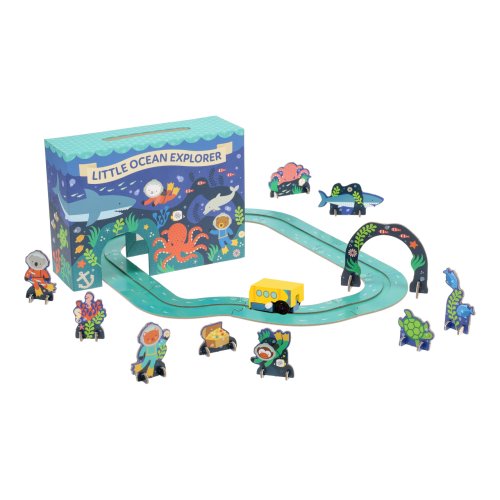 Čakajú na vás neuveriteľné podvodné dobrodružstvá! Natiahnite drevenú ponorku a sledujte, ako sa pohybuje po morskom dne. Prejde koralovým útesom, okolo potápačov hľadajúcich poklad, jej posádka uvidí mnoho druhov morských živočíchov. Perfektná hračka pre hodiny predstavivej hry, vhodná pre deti od 3 rokov. Škatuľku je možné vďaka bavlnenej šnúrke jednoducho prenášať. Potlačené netoxickými farbami na báze vody. Hlavné vlastnosti: drevená naťahovacia ponorka, 8 dielikov koľajníc, 10 dielikov postavičiek jednoducho zostaviteľná traťbalené bez plastu s ohľadom na životné prostredie vhodné domov aj na cesty FSC papier potlačené netoxickými farbami na báze vody bol produkt vyrobený, nebolo vyťažené nelegálne a pochádza z lesov obhospodarovaných šetrným či prírode blízkym spôsobom, v ktorom sú dodržiavané prísne environmentálne a sociálne požiadavky. Značka FSC® na výrobku znamená, že svojim nákupom pomáhate chrániť lesy a podporujete šetrné, zodpovedné či prírode blízke hospodárenie, vďaka ktorému sú naše lesy stabilnejšie, zdravšie, majú prirodzenú druhovú skladbu a lepšie odolávajú negatívnym následkom klimatických zmien.