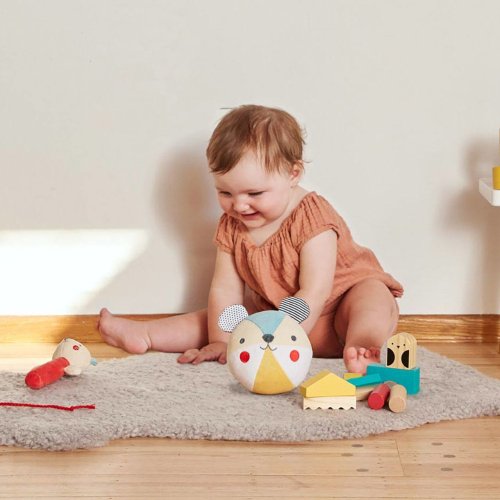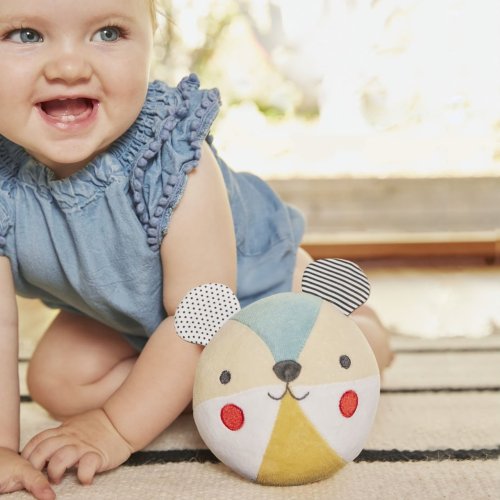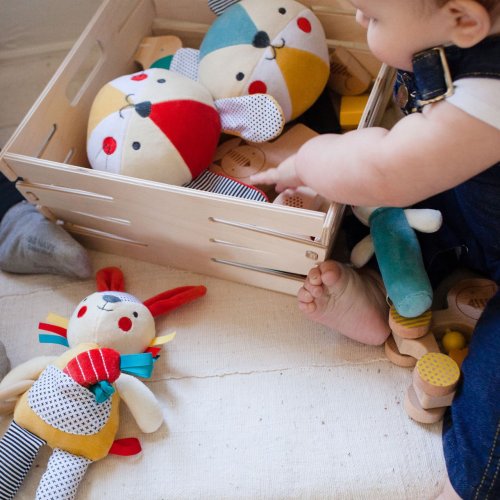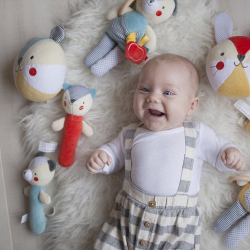 Textilná hrkálka pre deti od narodenia. Hlavné vlastnosti: Použité farby na rastlinnej báze šetrné k životnému prostrediuVyrobené z organickej bavlny najvyššej kvality, certifikované GOTS