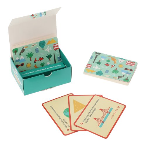 Staňte sa svetobežníkmi s touto kvízovou hrou. Ľahko s ňou môžete deťom rozšíriť obzory a pomáhať s učením, poslúži ako spestrenie na listovanie atlasom, alebo cestovanie po glóbuse. Každá z originálne ilustrovaných kariet obsahuje zemepisnú otázku s odpoveďou, napríklad: „Ktoré mesto je známe svojim slávnym mostom Golden Gate?“ Hra je v anglickom jazyku a je vhodnou pomôckou na precvičovanie angličtiny. Skvelá zábava na cesty aj pre daždivé dni trávené doma! Hlavné vlastnosti: 50 kariet s kvízovými otázkami vhodné na precvičovanie angličtiny vyrobené zo 100% FSC® certifikovaného papiera potlačené rastlinnými atramentmi Značka a certifikát FSC® (Forest Stewardship Council) zaručuje, že drevo, z ktorého bol produkt vyrobený, nebolo vyťažené nelegálne a pochádza z lesov obhospodarených či prírode blízkym spôsobom, v ktorom sú dodržiavané prísne environmentálne a sociálne požiadavky. Značka FSC® na výrobku znamená, že svojim nákupom pomáhate chrániť lesy a podporujete šetrné, zodpovedné či prírode blízke hospodárenie, vďaka ktorému sú naše lesy stabilnejšie, zdravšie, majú prirodzenú druhovú skladbu a lepšie odolávajú negatívnym následkom klimatických zmien.