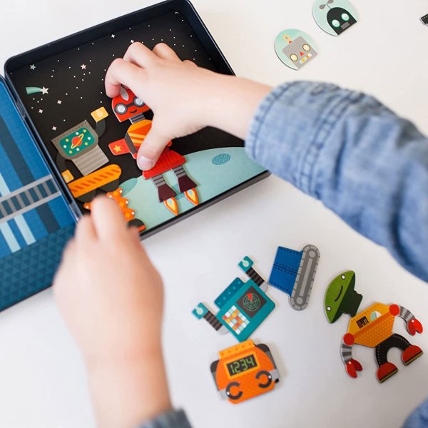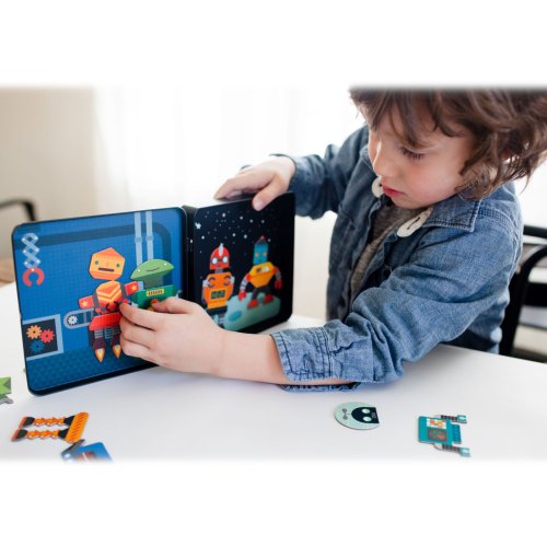 Pripnite magentov na tabuľku a vytvárajte rôzne postavičky robotov! Balenie obsahuje cez 25 magnetických dielikov, s ktorými sa deti dokážu vyhrať. Zabalené v plechovej krabičke, ktorá sa dá pevne zavrieť, perfektná hračka na cesty. Plechová krabička má vo vnútri, na stenách, dve scenérie. Hlavné vlastnosti: Podporuje predstavivosť detíNatlačené netoxickými farbamiSpĺňa všetky bezpečnostné normy