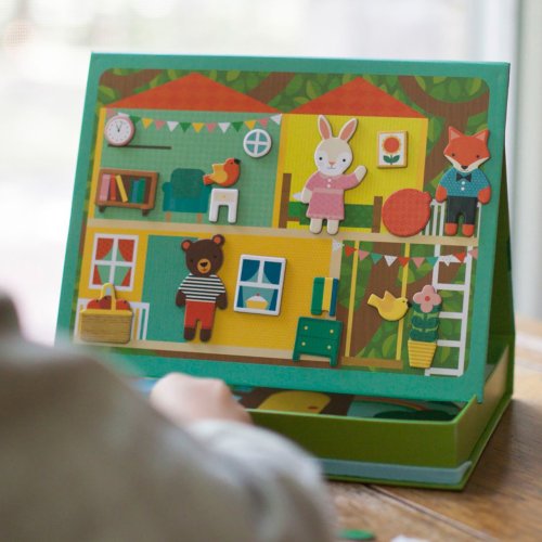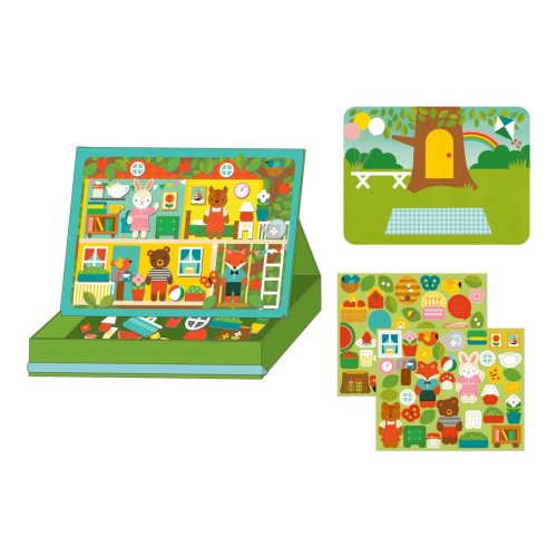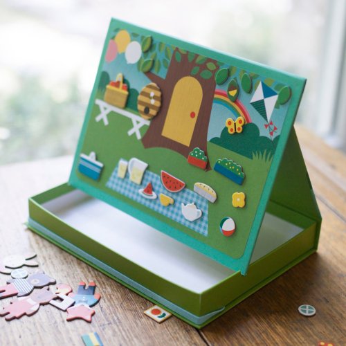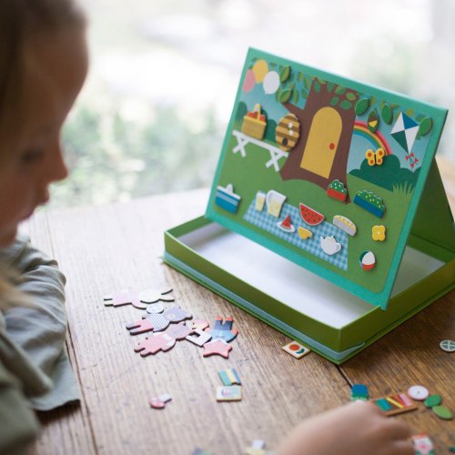 Dekorujte svoj zvierací domček alebo vytvorte roztomilý piknik pre zvieratá v parku. Tento prenosný hrací set je možné použiť ako divadielko. Má dve pozadia, z ktorých si môžete vybrať, a tiež cez 72 magnetických dielikov. Magnetickú scénku je možné postaviť vďaka zarážkam v krabici. Škatuľa v štýle stojana obsahuje elastickú gumičku, ktorú môžete použiť na rýchle upratovanie. Kreatívna hračka s nekonečnými možnosťami kombinácií a scén. Pre deti od 3 rokov veku. Hlavné vlastnosti: 72 magnetických dielikov 2 magnetické tabuľkyPevná konštrukciaZ recyklovaných materiálov potlačených rastlinnými atramentmiSpĺňa všetky bezpečnostné normy