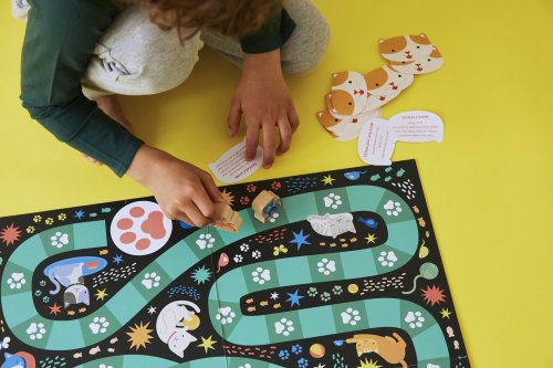 Táto krásna stolová hra otestuje vaše vedomosti o mačkách a ich dobrodružstvách! Budete plniť niektoré z 51 úloh, ako mačky! Vyberte si svoju mačaciu figúrku a môžete začať hrať. Vyhráva ten, kto ako prvý vkročí na klbko. Obsahuje 1 hraciu dosku, 4 figúrky, 1 drevenú kocku, 51 kartičiek s úlohami v angličtine, španielčine a francúzštine. Hlavné vlastnosti: obsahuje hernú dosku, kocku, 4 figúrky, 51 kartičiek s úlohami v 3 jazykoch natlačené rastlinnými farbami drevené figúrky Skrátený návod hry: Začína hráč, ktorý ako posledný v poslednom čase pohladil mačku. Prvý hráč hodí kockou a posunie sa o počet polí, podľa hodnoty hodené na kocke. Ak stúpne na políčko s mačacou packou, vezme si kartu a splní danú úlohu. Splňte úlohu a posuňte sa o počet polí, ktorý je uvedený na karte. Pokiaľ hráč nemôže splniť úlohu z karty, položí ju na odkladací balíček, textom hore. Na rade je ďalší hráč. Hra pokračuje, hráči sa na ťahoch striedajú podľa určeného poradia. Hádžte kockou, posúvajte figúrky, berte si kartičky podľa paciek a plňte úlohy. Pokiaľ ste použili všetky kartičky, jednoducho zamiešajte odkladací balíček a hra môže pokračovať.