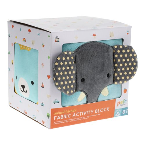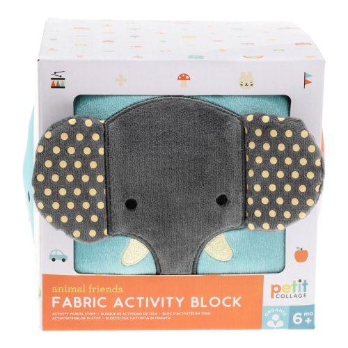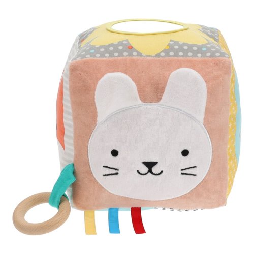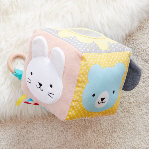 Mäkká a hebká kocka prevedením stimuluje hmat najmenších. Je vyvedená v kontrastných farbách a vybavená rolničkou, aby pútala pozornosť. Na stenách sú vyobrazené priateľské tváre zvieratiek, ktoré stimulujú zvedavosť vyčnievajúcimi uškami. Kocka je tiež vybavená zrkadlom, dozdobená niekoľkými stuhami a vybavená dreveným krúžkom slúžiacim ako hryzátko. Je vyrobená z organickej bavlny a plnená materiálom z recyklovaných plastových fliaš. Hlavné vlastnosti: mäkké a hebké prevedenie obsahuje rolničku, zrkadlo a hryzátko nízka hmotnosť