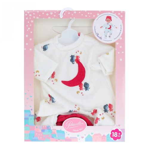 Obleček určený najmä pre bábiky Petitcollin rady Petit Câlin zodpovedajúcej veľkosti. Skladá sa z bieleho pyžamka s potlačou a červenej čiapočky. Oblečky Petitcollin sú starostlivo spracované, vynikajú francúzskou eleganciou, jedinečnou farebnosťou a vzormi, vďaka ktorým sú pútavé a nezameniteľné. Dodávané v papierovej krabičke s priehľadom a plastovým ramienkom. Hlavné vlastnosti:pre bábiky s výškou 36 cmpyžamko a čiapočkavyrobené v Tunisku