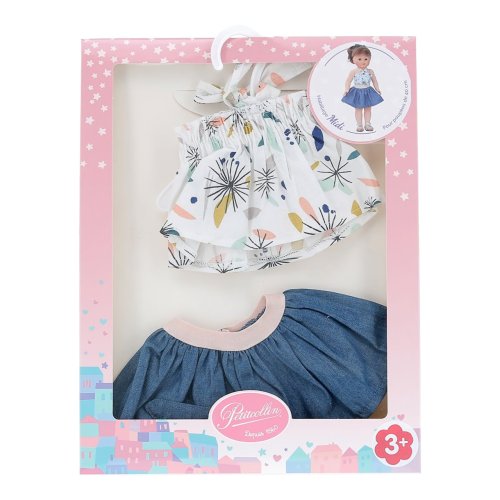 Obleček určený najmä pre bábiky Petitcollin radov Émilie, Francette a Marie-Françoise. Skladá sa zo vzorovanej blúzky, modrej sukienky a stuhy do vlasov. Oblečky Petitcollin sú starostlivo spracované, vynikajú francúzskou eleganciou, jedinečnou farebnosťou a vzormi, vďaka ktorým sú pútavé a nezameniteľné. Dodávané v papierovej krabičke s priehľadom a plastovým ramienkom. Hlavné vlastnosti: pre bábiky s výškou 39–40 cm blúzka, sukienka a stuha vyrobené v Tunisku