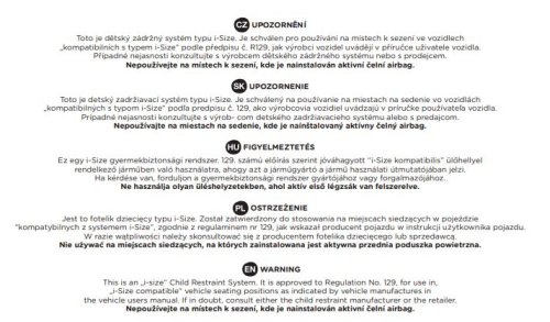 Toto je detský zádržný systém typu i-Size. Je schválený pre používanie na miestach na sedenie vo vozidlách „kompatibilných s typom i-Size“ podľa predpisu č. R129, ako výrobcovia vozidiel uvádzajú v príručke používateľa vozidla. Prípadné nejasnosti konzultujte s výrobcom detského záchytného systému alebo s predajcom. Nepoužívajte na miestach na sedenie, kde je nainštalovaný aktívny čelný airbag.