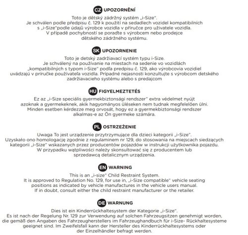 UPOZORNENIE Toto je detský záchytný systém „i-Size“. Je schválený podľa predpisu č. 129 na použitie na sedadlách vozidiel kompatibilných s „i-Size“ podľa údajov výrobcu vozidla v príručke pre používateľov vozidla. V prípade pochybností sa poraďte s výrobcom alebo predajcom detského záchytného systému.