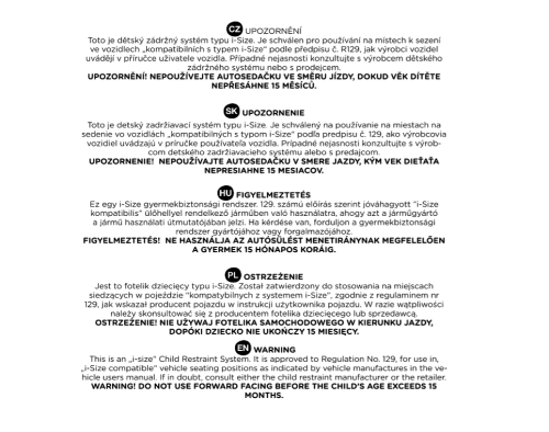 UPOZORNENIE Toto je detský záchytný systém typu i-Size. Je schválený pre používanie na miestach na sedenie vo vozidlách kompatibilných s typom i-Size, 129, ako výrobcovia vozidiel uvádzajú v príručke používateľa vozidla. Prípadne nejasnosti konzultujte s výrobcom detského záchytného systému alebo s predajcom. UPOZORNENIE! NEPOUŽÍVAJTE AUTOSEDAČKU V SMERE JAZDY, KÝM VED DIEŤATE NEPRESIAHNE 15 MESIACOV!