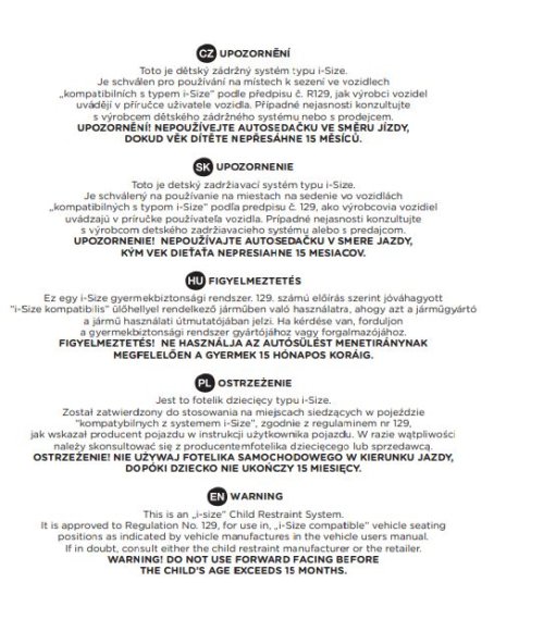 UPOZORNENIE Toto je detský záchytný systém typu i-Size. Je schválený pre používanie na miestach na sedenie vo vozidlách kompatibilných s typom i-Size, 129, ako výrobcovia vozidiel uvádzajú v príručke používateľa vozidla. Prípadne nejasnosti konzultujte s výrobcom detského záchytného systému alebo s predajcom. UPOZORNENIE! NEPOUŽÍVAJTE AUTOSEDAČKU V SMERE JAZDY, KÝM VED DIEŤATE NEPRESIAHNE 15 MESIACOV!
