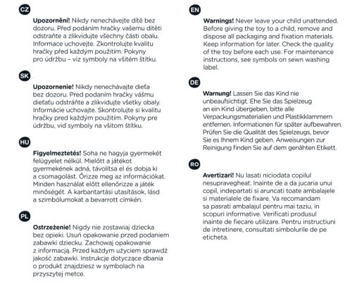 UPOZORNENIE! Nikdy nenechávajte dieťa bez dozoru. Pred podaním hračky vášmu dieťaťu odstráňte a zlikvidujte všetky obaly. Informácie uchovajte. Skontrolujte si kvalitu hračky pred každým použitím. Pokyny pre údržbu, viď symboly na všitom štítku.