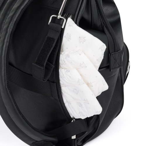 Batoh váži menej ako kilogram a je vyrobený z kvalitného vodeodolného PU materiálu pre stabilitu a dlhú životnosť. Bočné odnímateľné popruhy umožňujú batoh ľahko pripevniť na kočík akejkoľvek značky. Ramenné popruhy s extra vrstvou peny zaručujú pohodlie aj pri dlhodobom nosení a vnútorná podšívka vo svetlej farbe uľahčuje rýchle nájdenie vecí, ktoré potrebujete, a udržiavanie poriadku.