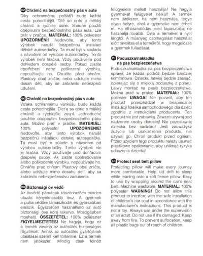 UPOZORNENIE Nedovoľte, aby tento výrobok narušil bezpečnú inštaláciu detskej autosedačky. Tá musí byť v súlade s návodom od výrobcu autosedačiek. Tento výrobok nie je hračka. Vždy používajte pod dohľadom dospelej osoby. Ak zistíte opotrebovanie alebo poškodenie výrobku, nepoužívajte ho. Chráňte pred ohňom. Plastový obal zničte alebo udržujte mimo dosahu detí, aby sa zabránilo nebezpečenstvu udusenia.