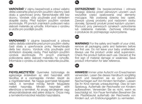 UPOZORNENIE V záujme bezpečnosti a zdravia vášho dieťaťa odstráňte pred prvým použitím všetky časti obalu a upevňovacie prvky. Nenechávajte dieťa bez dozoru. Výrobok vždy používajte pod dohľadom dospelej osoby. Pred každým použitím výrobok skontrolujte. Pri prvých známkach poškodenia alebo slabosti materiálu ho vyhoďte. Informácie o výrobku si uložte na neskoršie použitie.