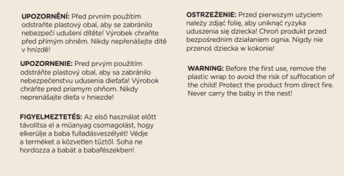 UPOZORNENIE Pred prvým použitím odstráňte plastový obal, aby sa zabránilo nebezpečenstvu udusenia dieťaťa! Výrobok chráňte pred priamym ohňom. Nikdy neprenášajte dieťa v hniezde!