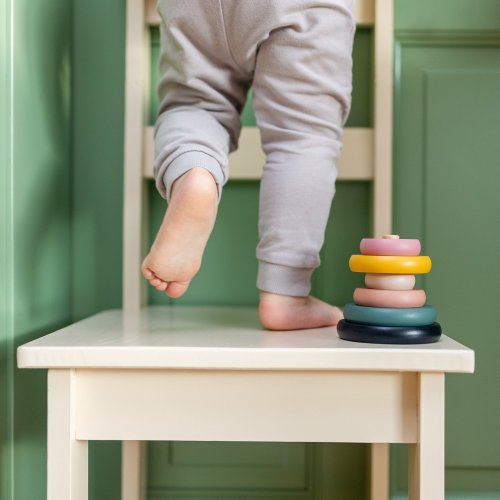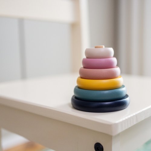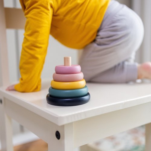 Okrem zlepšovania šikovnosti malých ručičiek a koordinácie oko-ruka, skladačka rozvíja aj priestorovú predstavivosť a schopnosť rozpoznávať tvary a farby. Je ideálny pre deti, ktoré práve začínajú svoje dobrodružstvo so skladaním kociek a vytváraním veží. Pyramída sa skladá zo 6 farebných diskov, ktoré dieťa umiestni na základňu s kolíkom. Hračka dokonale rozvíja zmysel pre pozorovanie a učí logickému mysleniu. Vďaka pevnému spracovaniu je stabilná a odolná.