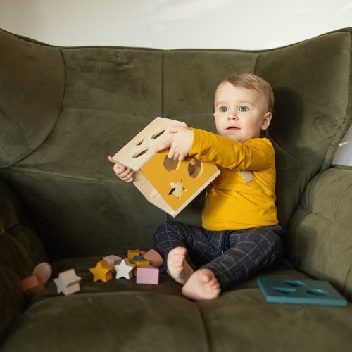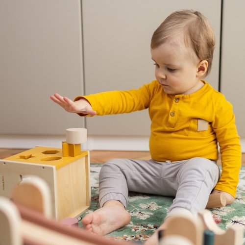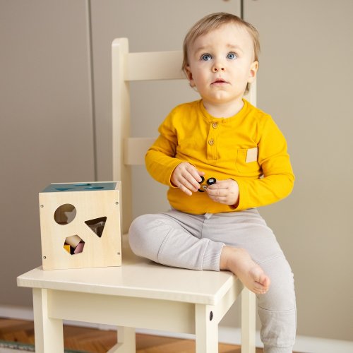 Súprava obsahuje drevenú kocku so štyrmi stranami na triedenie a 12 farebných kociek rôznych tvarov, napríklad trojuholníka, hviezdy, štvorca, kosoštvorca alebo kruhu. Keď sú všetky dieliky vo vnútri triediacej kocky, jednoducho vysuniete horný kryt, aby ste ich mohli ľahko vybrať späť. Deti môžu nielen priraďovať tvary k otvorom a triediť diely, ale tiež ich používať na stavbu rôznych prvkov. Hračka je určená pre deti od 1 roku. Súprava obsahuje triediacu kocku a 12 farebných dielikov. Každý prvok je starostlivo testovaný, odolný voči hádzaniu a úderom, čo zaručuje trvanlivosť aj počas intenzívnej hry.