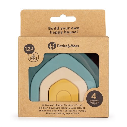 Silikónová skladacia hračka HOUSE Postavte si svoj vlastný šťastný domček! Silikónová skladacia hračka HOUSE sa skladá zo štyroch oblúkových prvkov, ktoré po umiestnení jeden na druhý vytvoria pekný domček. Tento domček je kúzelnou bránou do sveta tvarov, farieb a poznávania. Skladanie oblúkov, ich otáčanie alebo ukladanie jedného oblúka na druhý je výborným cvičením pre malé ručičky. Dieťa si precvičuje presnosť pohybov a koordináciu. Skladačka vzbudzuje záujem dieťaťa, príjemným a pútavým spôsobom sústreďuje jeho pozornosť a učí ho tvorivému mysleniu. Usporiadanie neukladá konkrétne pravidlá, čím sa podporuje kreativita. Dieťa sa pritom skvele baví, môže vytvárať vlastné verzie skladačky, rozvíjať si konštrukčné schopnosti a precvičovať svoju priestorovú predstavivosť.