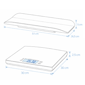 Rozlíšenie: 5 g (váha zobrazuje hmotnosť po 5 g) Presnosť merania: • 0 kg ≤ m ≤ 5 kg: ±50 g • 5 kg < m ≤ 20 kg: ±100 g • 20 kg < m ≤ 50 kg: ±150 g 180 kg: ±300 g Váha (bez vaničky) • Rozmery: 30 × 30 × 2,5 cm • Hmotnosť: 1,5 kg • Materiál: 6 mm tvrdené sklo Vanička na váženie dojčiat • Rozmery: 51 × 26,5 × 5 cm • Hmotnosť: 0,39 kg dojča: 20 kg Prevádzkové podmienky: 0–40 °C, relatívna vlhkosť 25–85 % (bez kondenzácie) Podmienky skladovania: –20 až 60 °C, relatívna vlhkosť 20–90 % (bez kondenzácie) Celková hmotnosť výrobku: cca 3,9 kg Celkové rozmery (zostavené): cca 5