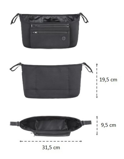 Dve bočné priehradky uskladnia fľašu, termosku alebo hrnček s kávou. Do veľkej prostrednej priehradky ľahko umiestnite všetko čo potrebujete počas prechádzky či výletu. Predné odnímateľné vrecko môžete používať aj samostatne. Je vhodná na uskladnenie mobilu a obsahuje aj port pre slúchadlá, takže počas kočíkovania môžete počúvať svoju obľúbenú hudbu, prípadne telefonovať. Ak si urobíte zastávku na detskom ihrisku, jednoducho odzipsujete vrecko s mobilom a inými cennosťami a vezmete si ju so sebou.