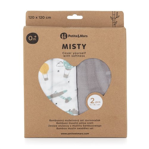 PETITE&MARS Prikrývka bambusová mušelínová 2ks Misty Grey Planes 2v1, 120 x 120 cm