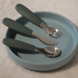 Funkčné časti sú vyrobené z vysoko kvalitnej nerezovej ocele, zatiaľ čo ergonomické rukoväte sú potiahnuté mäkkým silikónom vhodným na styk s potravinami, prispôsobeným malým detským ručičkám. Vďaka tomu je úchop pohodlný a bezpečný, čo pomáha rozvíjať správne návyky pri jedle.