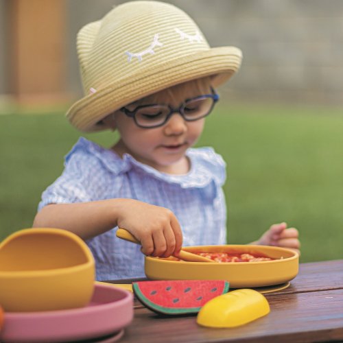 Silikónový tanier TAKE&MATCH s prísavkou Praktický tanier je celý vyrobený z potravinárskeho silikónu bez obsahu BPA. Vďaka tomu ho možno bezpečne používať na všetky potraviny, teplé aj studené, a jedlo v ňom je možné bez obáv ohrievať v mikrovlnnej rúre alebo uchovávať v chladničke. Vďaka odolnému a mäkkému silikónu sa nemusíte obávať, že sa tanier rozbije, odštiepi alebo zdeformuje - môžete ho nepoškodený používať dlhú dobu. Je vhodný pre deti od 6 mesiacov, ktoré sa zoznamujú s rozšírenou stravou, a pre tie, ktoré sa už úspešne učia jesť samy. Zaoblený tvar uľahčuje dieťatku jedenie. Pre pohodlie dieťaťa i rodičov má tanier prísavku, ktorá priľne k povrchu stola alebo stoličky.