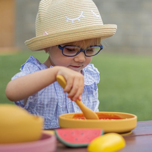 Silikónový tanier TAKE&MATCH s prísavkou Praktický tanier je celý vyrobený z potravinárskeho silikónu bez obsahu BPA. Vďaka tomu ho možno bezpečne používať na všetky potraviny, teplé aj studené, a jedlo v ňom je možné bez obáv ohrievať v mikrovlnnej rúre alebo uchovávať v chladničke. Vďaka odolnému a mäkkému silikónu sa nemusíte obávať, že sa tanier rozbije, odštiepi alebo zdeformuje - môžete ho nepoškodený používať dlhú dobu. Je vhodný pre deti od 6 mesiacov, ktoré sa zoznamujú s rozšírenou stravou, a pre tie, ktoré sa už úspešne učia jesť samy. Zaoblený tvar uľahčuje dieťatku jedenie. Pre pohodlie dieťaťa i rodičov má tanier prísavku, ktorá priľne k povrchu stola alebo stoličky.