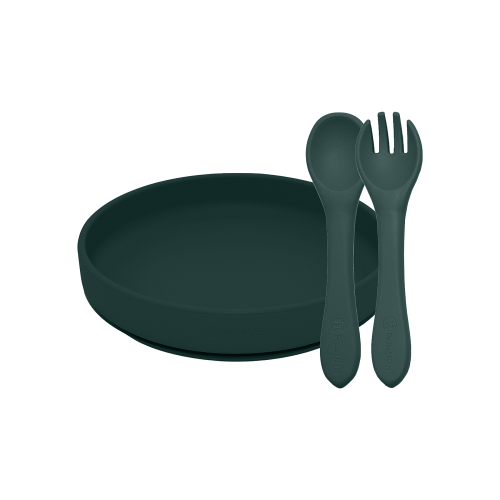 PETITE&MARS Set jedálenský silikónový TAKE&MATCH 2 ks tanier + príbor Misty Green 6m+