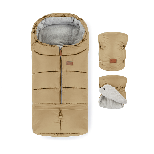 Komplet výbava na zimné kočíkovanie. Hrejivý predĺžiteľný fusak Jibot 3v1 pre bábätko a hrejivé rukavice Jasie na kočík pre mamičku. Všetko krásne zladené v jednotnom odtieni.